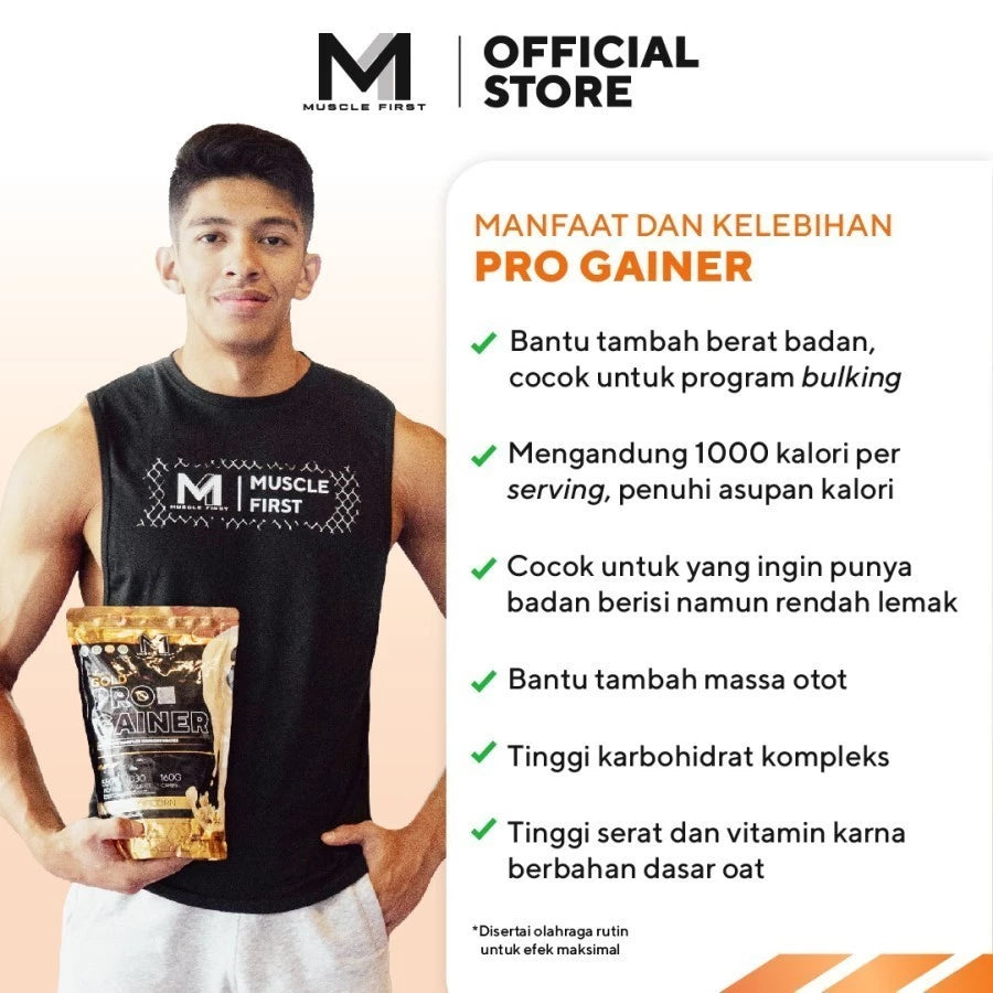 - cocok untuk laki-laki maupun perempuan yang underweight dan tidak ada waktu banyak untuk menyiapkan makanan penuh nutrisi karena Mucle First Gold ProGainer mengandung protein, carbs, dan vitamin baik untuk tubuh