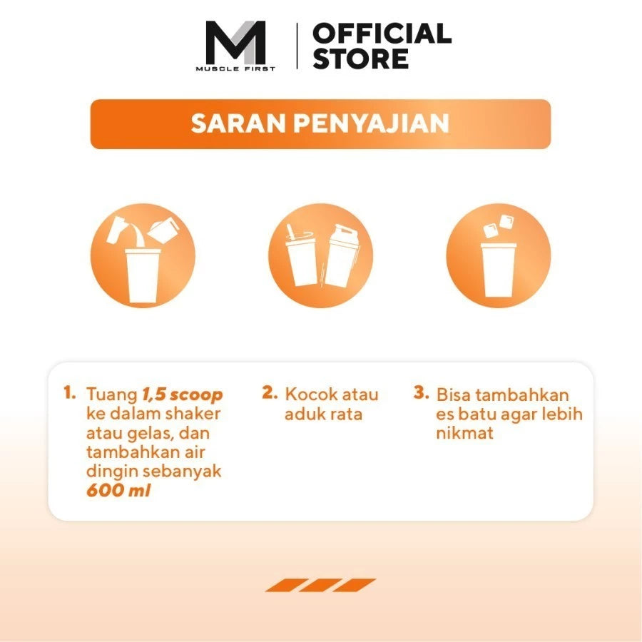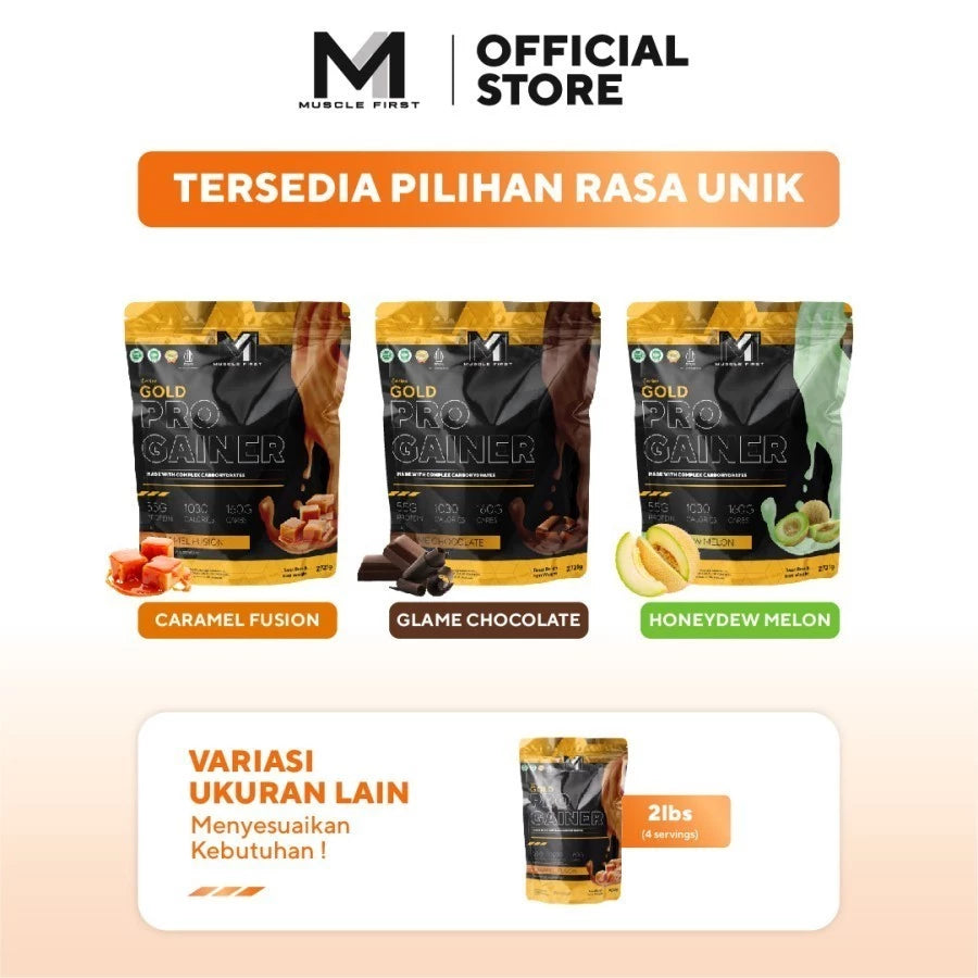 - cocok untuk laki-laki maupun perempuan yang underweight dan tidak ada waktu banyak untuk menyiapkan makanan penuh nutrisi karena Mucle First Gold ProGainer mengandung protein, carbs, dan vitamin baik untuk tubuh