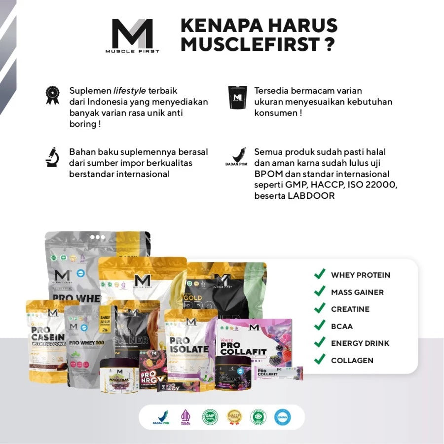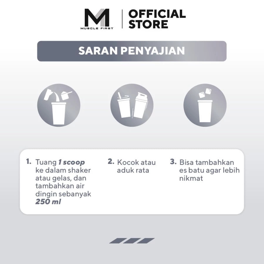 Inovasi baru dari Muscle First untuk mencukupi kebutuhan protein harian dengan harga ekonomis dan kualitas terbaik! Mengandung 24g protein dan hanya 130 kalori!