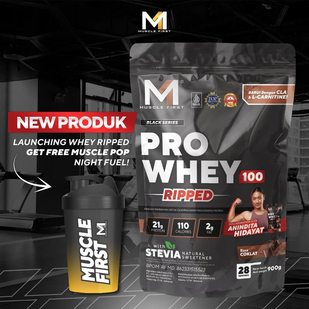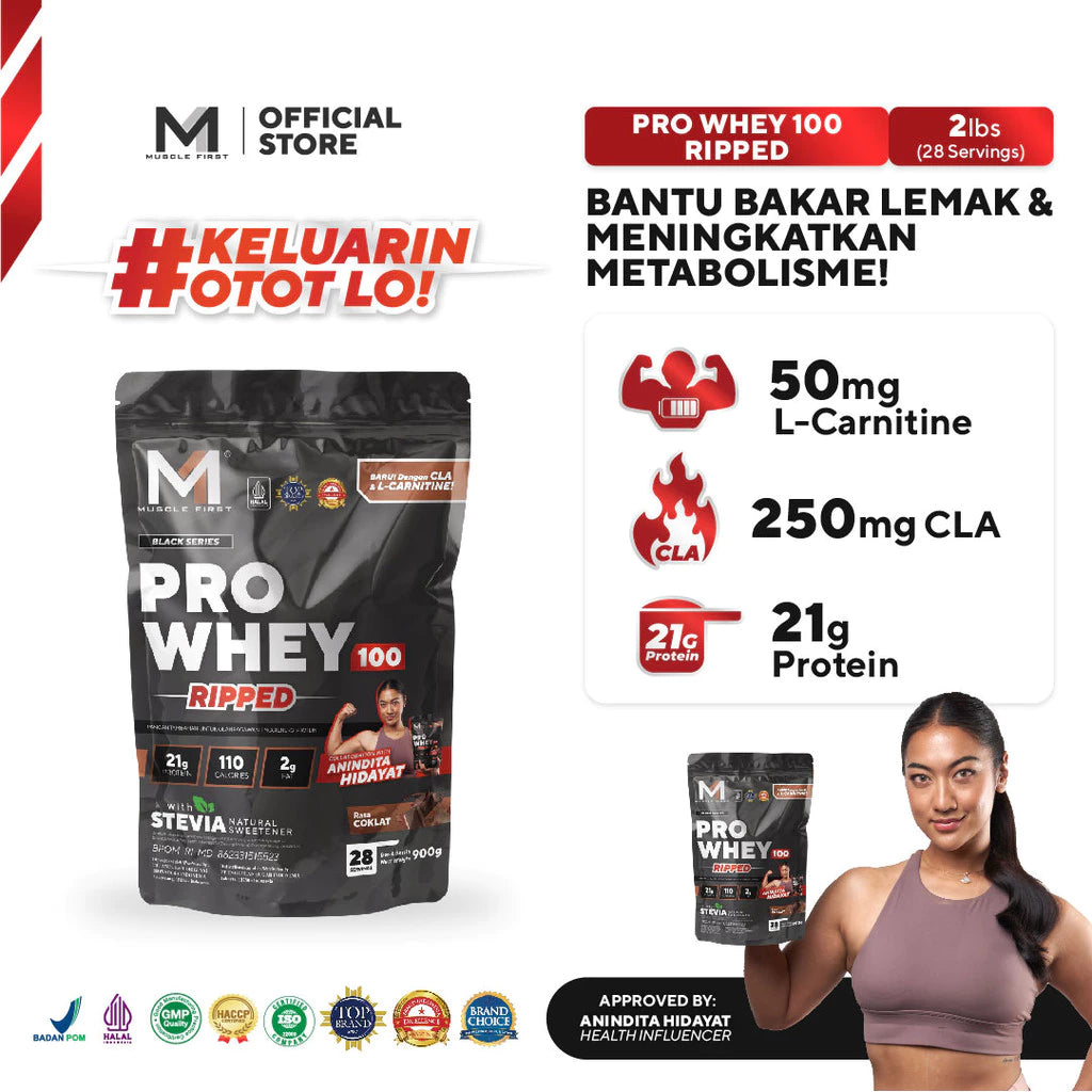 Pro Whey 100 Ripped adalah whey protein rendah kalori dari Muscle First hasil kolaborasi dengan Anindita Hidayat. Mengandung 21g protein, hanya 110 kalori per sajian, serta dilengkapi dengan fat burning formula (L-Carnitine, CLA, dan Green Tea Extract). Diformulasikan untuk kamu yang ingin membentuk badan lebih lean & tone.