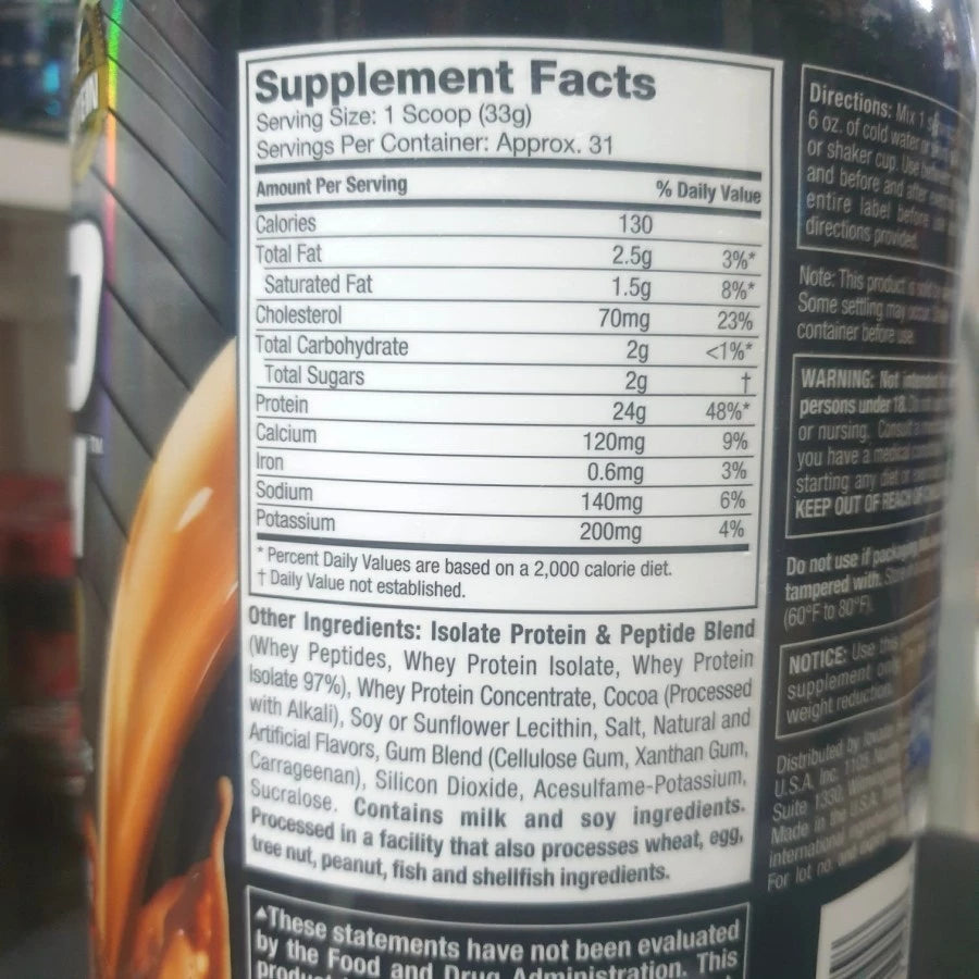 Protein isolat & campuran peptida (peptida whey, isolat protein whey, isolat protein whey 97%), konsentrat protein whey, kakao (diproses dengan alkali), lesitin kedelai atau bunga matahari, garam, perasa alami dan buatan, campuran getah (gum selulosa, xanthan gum, carrageenan), silikon dioksida, acesulfame-potassium, sucralose.